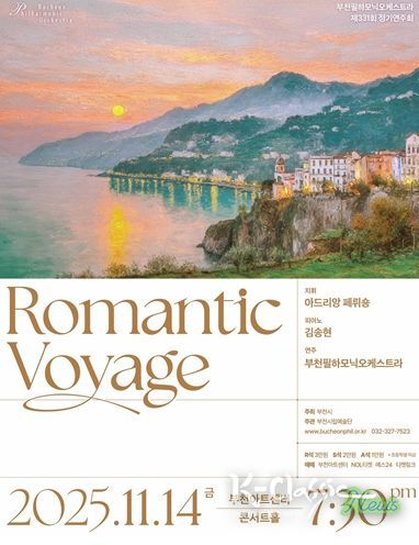 K-Classic News 기자 | 부천필하모닉오케스트라가 오는 11월 14일 오후 7시 30분 부천아트센터 콘서트홀에서 제331회 정기연주회 'Romantic Voyage'를 개최한다. 공연에는 상임지휘자 아드리앙 페뤼숑과 부천필이 무대에 오르며, 협연자로는 탁월한 음악적 이해력과 구성력으로 호평받는 피아니스트 김송현이 ‘낭만적 여정’에 함께 오른다.
