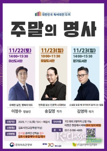 K-Classic News 기자 | 김포시는 ‘2025 대한민국 독서대전’의 일환으로 시민이 책과 인문 강연을 통해 삶의 방향을 모색할 수 있는 인문 강연 『주말의 명사』를 오는 11월 22일부터 23일까지 3개 도서관에서 진행한다.