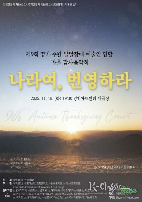 K-Classic News 기자 | “나라여, 번영하라”, 우리나라의 안정과 번영을 기원하는 뜻으로 2025년 11월 18일 19시 30분, 경기아트센터 대극장에서 경기.수원 발달장애 예술인들이 연합으로 제9회 가을 감사음악회를 개최한다.