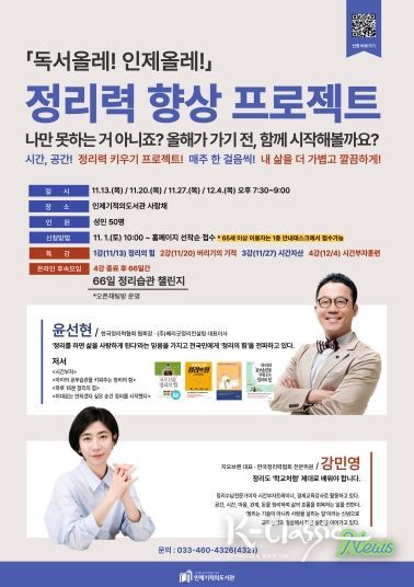 K-Classic News 기자 | 인제기적의도서관이 오는 11월부터 12월까지 현대인의 효율적인 공간‧시간 관리법을 주제로 한 ‘정리력 향상 프로젝트’ 특강을 운영한다. 이번 특강은 체계적인 정리 습관을 통해 군민의 삶의 질을 높이고, 지속 가능한 정리 문화를 확산시키는 데 목적이 있다.