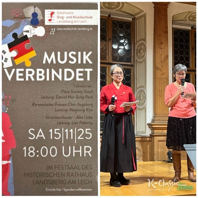 Mit einem langsamen Zug, der einem regionalen Mugunghwa-Express (in Korea) ähnelt, erreicht man nach etwa fünfzig Minuten westlicher Fahrt von München die Stadt Landsberg am Lech. Diese Stadt, in der mittelalterliche Festungsmauern und die Spuren verschiedener Kriege noch immer sichtbar sind, trägt in jedem ihrer Steine die Schichten der europäischen Geschichte – von der Entwicklung einer befestigten Handelsstadt des 12. Jahrhunderts bis zu den Wunden, die die Kriege hinterlassen haben, bewahrt eine stille Aufmerksamkeit für die Zeit der Menschen. Am Samstag, dem 15. November 2025, um 18 Uhr fand im Festsaal des Historischen Rathauses ein besonderes Konzert der Städtischen Sing- und Musikschule Landsberg am Lech statt. Auf Initiative von Somin Cha, die seit über fünfzehn Jahren an dieser Schule Violine und Viola unterrichtet, sowie von Daniel Hai-Sung Park, dem Leiter der Korea Flute-Society (World Folk Music Society), reisten Flötistinnen aus Korea an. Gemeinsam mit dem Koreanischer Frauenchor Augsburg (Leitung: Heejeong Kim) und dem Streichorchester Alte Liebe (Leitung: Lisa Pokorny) webten sie aus den Fäden Koreas und Deutschlands ein rund 120-minütiges musikalisches Gewebe. Der Eintritt war frei, Spenden waren willkommen – eine zurückhaltende, aber klare Geste für den Charakter dieses Abends.
