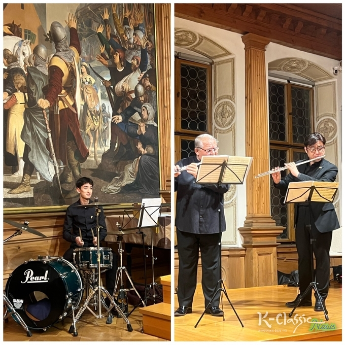 뮌헨에서 무궁화호를 닮은 느린 기차를 타고 약 50분 서쪽으로 달리면, 레흐 강가에 자리한 란츠베르크 Landsberg 도시에 도달한다. 이 도시는 중세의 성벽과 여러 전쟁이 남긴 흔적이 아직도 곳곳에 남아 있어, 12세기 요새화된 상업 도시의 성장에서부터 전쟁이 새겨놓은 상처에 이르기까지, 유럽 역사의 층위를 돌마다 품고 있는 장소이다. 2025년 11월 15일 토요일 저녁 6시, 이 도시의 시청 안 아름다운 연회장 Festsaal에서 란츠베르크 시립음악학교가 마련한 특별한 무대가열렸다. 이 시립학교에서 15여 년간 바이올린과 비올라를 가르쳐 온 한국인 차소민, 그리고 월드포크뮤직 소사이어티 소속 코리아 플루트소사이어티의 지휘자 박해성의 기획 아래 한국에서 도착한 플루트 연주자들은 아우크스부르크 여성합창단(지휘: 김희정), 현악 앙상블“Alte Liebe”(지휘: Lisa Pokorny)와 함께 한국과 독일이라는 씨실과 날실로 120여 분의 음악을 직조했다. 입장은 무료였고, 기부만받는 겸손한 방식이 이 공연의 성격을 또렷하게 했다.