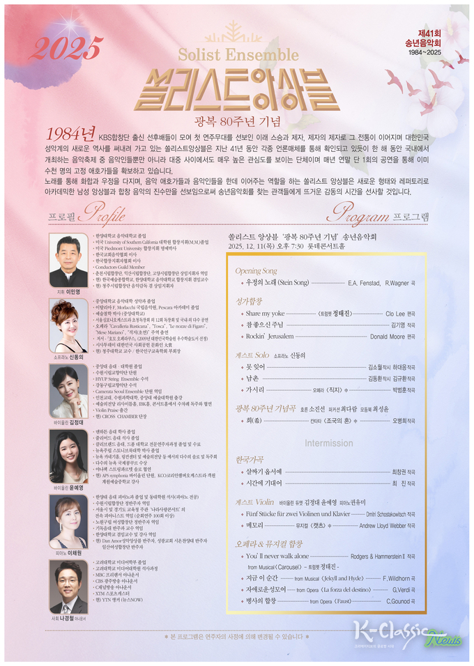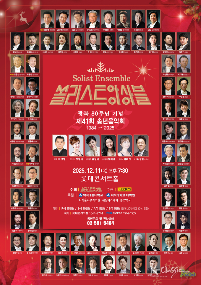 이번 송년무대는 ‘우정의 노래(Stein Song)’로 시작해 성가합창, 한국가곡, 오페라, 뮤지컬 등 관객층이 폭넓게 공감할 수 있는 구성으로 무대가 꾸며진다. 특히 광복 80주년 기념 칸타타 <조국의 혼> 中 ‘희(希)곡은 광복의 역사적 의미를 음악적으로 재해석한 작품으로, 호른과 타악의 힘 있는 앙상블이 더해져 시대의 메시지를 현대적 감성으로 표현한다. 쏠리스트 앙상블의 41번째 송년음악회는 연말을 맞아 음악을 통해 서로를 응원하고 위로하는 특별한 시간이 될 것으로 기대된다.