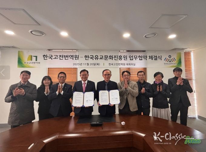 K-Classic News 기자 | 한국유교문화진흥원과 한국고전번역원은 11월 20일, 양 기관의 상생 발전을 위한 업무협약을 한국고전변역원 대회의실에서 체결했다.