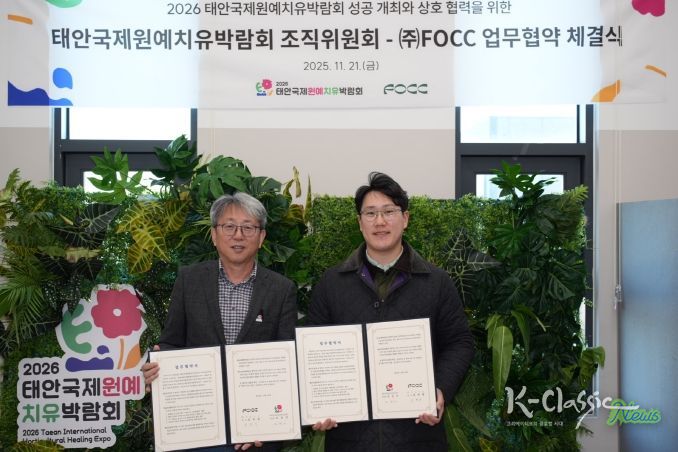K-Classic News 기자 | 태안국제원예치유박람회조직위는 11월 21일 조직위 사무실에서 향(香) 전문기업 ㈜FOCC와 업무협약을 체결했다고 밝혔다. 이번 협약은 박람회 고유의 정체성을 강화하고 차별화된 관람 경험을 제공하기 위한 전략적 파트너십으로, ㈜FOCC의 대표 감성 브랜드 ‘히어로즈 오브 코리아(Heroes of Korea)’와 연계한 박람회 전용 시그니처 치유향(香) 개발이 핵심 내용이다.