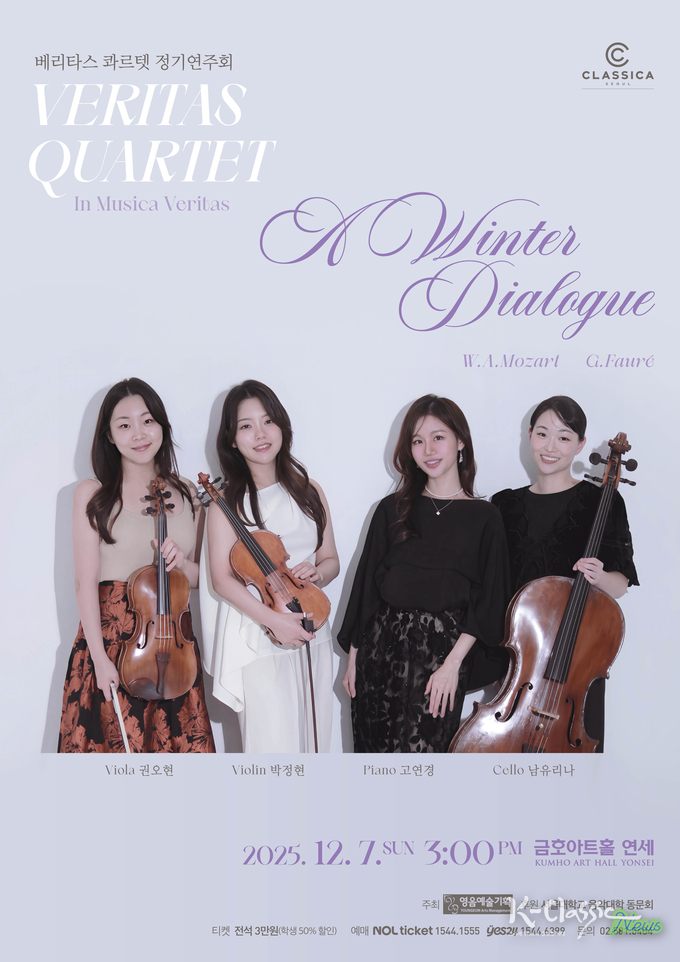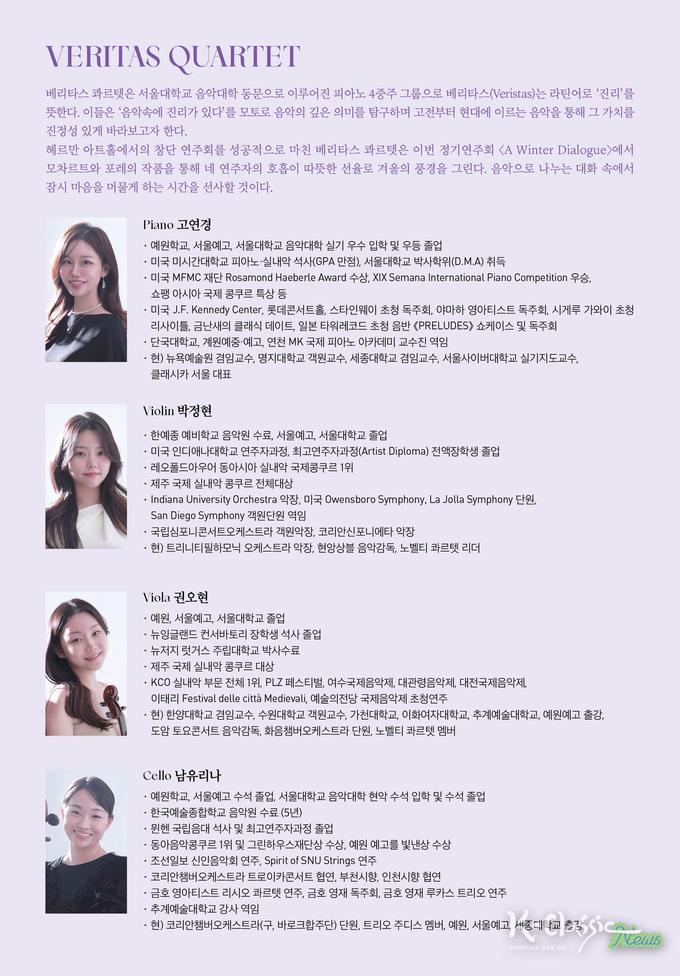 창단 연주회를 헤르만아트홀에서 성황리에 마친 베리타스 콰르텟(피아노 고연경, 바이올린 박정현, 비올라 권오현, 첼로 남유리나)은 이번 무대를 통해 겨울의 풍경과 감성을 음악 속 대화로 펼쳐낸다. 모차르트와 포레라는 두 작곡가의 세계를 대비시키며 피아노와 현악기의 따뜻한 음색이 한 호흡으로 얽히는 정교한 앙상블을 선보일 예정이다.