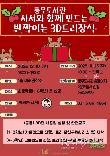이번 프로그램은 수강생의 학년에 따라 제작 도구의 난이도와 창작물이 구분되며, 참여 학생의 수준에 맞춘 맞춤형 체험활동으로 운영된다. 3D펜을 활용한 제작 경험을 통해 공간·입체 감각을 향상시키는 동시에 연말 크리스마스 시즌의 특색있는 분위기를 느낄 수 있다. 특히 풍무도서관 특화담당 사서가 직접 프로그램을 진행함으로써 안전하고 체계적인 지도가 이뤄질 것이다.