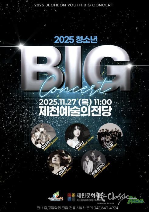 K-Classic News 기자 | (재)제천문화재단은 오는 27일 제천예술의전당에서 ‘2025 청소년 빅콘서트’를 개최한다고 밝혔다. 이번 공연은 수능을 마친 고등학교 3학년을 비롯한 지역 청소년들에게 휴식과 재충전의 시간을 제공하기 위해 마련된 특별한 문화행사다.