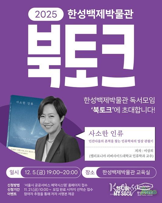 K-Classic News 기자 | 서울시 한성백제박물관은 올해 두 차례 운영된 역사독서모임 ‘북토크’를 12월 5일에 추가 개최한다고 밝혔다. 당초 연 2회 운영했으나 높은 시민 호응에 힘입어 추가 편성을 결정한 것이다. 이번 행사는 서울시 대표 야간문화 프로그램 ‘문화로 야금야금(夜金)’의 일환으로, 금요일 밤 박물관에서 역사학·고고학 분야 저자와 시민이 직접 소통할 수 있는 자리로 마련됐다.