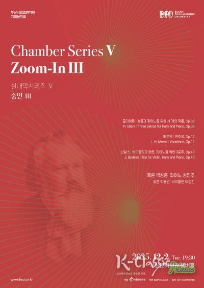'줌인' 시리즈는 한 명의 단원에 집중해 가까이서 호흡하고 음악으로 교감하는 기획 시리즈로, 2022년 12월 첫 공연을 올린 뒤 다양한 악기의 독주곡들로 관객들과 밀접하게 소통하며 많은 사랑을 받고 있다. 이번 무대에선 부산시립교향악단의 호른 부수석 백상흥과 피아니스트 성민주, 호르니스트 박용인과 바이올리니스트 이상진의 빛나는 호흡으로 아름다운 무대를 선사할 예정이다.
