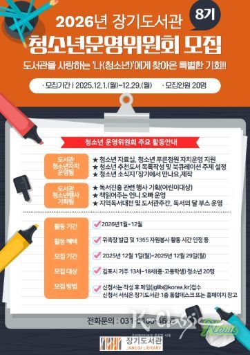 K-Classic News 기자 | 김포시 장기도서관은 2026년 제8기 청소년운영위원회 위원으로 활동할 김포시 거주 13세~18세 청소년 20명을 오는 12월 1일부터 모집한다.