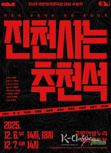 K-Classic News 기자 | (재)고양문화재단은 소극장 기획공연 시리즈인 ‘2025 새라새 ON 시리즈’의 12월 프로그램으로 평단과 관객의 극찬을 받은 연극 '진천 사는 추천석'을 오는 12월 6일과 7일 양일간 고양아람누리 새라새극장에서 개최한다.