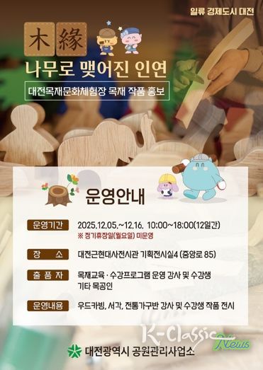 K-Classic News 기자 | 대전시는 공원관리사업소(목재문화체험장) 주관으로 12월 5일부터 16일까지 대전근현대전시관 기획전시실에서 목재교육·수강 프로그램에 참여한 강사와 수강생들의 작품 80여 점을 특별전시한다.