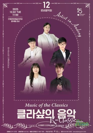 K-Classic News 기자 | 안동문화예술의전당은 지역예술인들에게 다양한 무대 경험을 제공하고, 시민에게는 일상 속 음악 향유할 수 있는 기회를 마련하고자, 매월 첫째 주 화요일 오전 11시에 로비음악회 시리즈를 진행하고 있다. 올해 마지막 로비음악회는 ‘클라샵’의 공연으로 12월 2일 오전 11시, 웅부홀 로비에서 '클라샾의 음악'이라는 제목으로 개최된다.