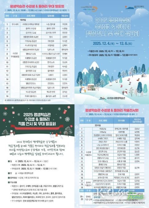 무대 발표회는 12월 6일 오전 10시부터 12시 30분까지 평생학습관 대강당에서 진행된다. 악기 연주, 댄스·퍼포먼스, 시니어 모델 워킹 등 18개 팀이 참여해 다양한 무대를 선보인다.