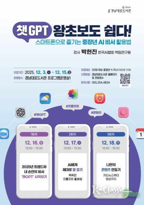 K-Classic News 기자 | 경남대표도서관은 중장년층의 디지털 역량 강화를 위해 AI 활용 교육 프로그램을 운영한다고 밝혔다.