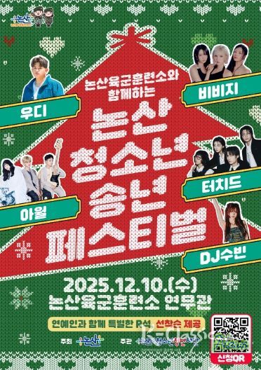 ‘청소년 송년페스티벌’은 지역 청소년들이 친구와 가족, 동료와 함께 한 해를 돌아보고 다음 해의 출발을 다짐하는 자리로, 논산시를 대표하는 연말 청소년 축제다. 올해 행사는 국방친화도시의 정체성을 살려 다시 육군훈련소 연무관에서 열리며, 관내 청소년과 군 장병·가족, 일반 시민 등이 함께 참여하는 열린 축제로 진행된다.