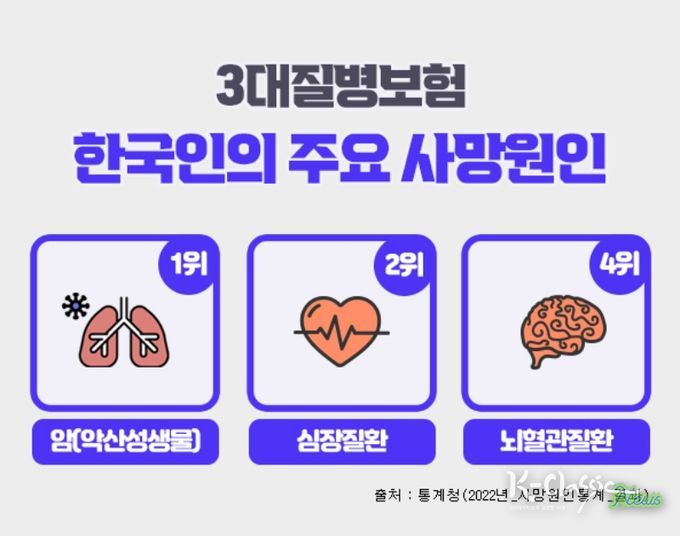 K-Classic News 기자 | 흔히 3대질병이라 일컫는 암, 심혈관질환, 뇌혈관질환은 통계청 발표자료에 따르면 한국인의 주요 사망원인 중에서 3위 폐렴을 제외하고 1~4위를 차지하고 있으며, 이전부터 지금까지도 살면서 가장 먼저 대비해야 하는 치명적인 질병으로 강조되고 있다. 이러한 중대질병에 대비하기 위하여 상기 세가지 치명적인 질병을 집중보장하는 3대질병진단비보험을 많이 가입하고 있다. 3대진단비보험은 각각의 질병을 중점적으로 보장하면서도 가입자 특성에 맞는 특약을 추가함으로써 종합건강보험으로도 활용할 수가 있다.