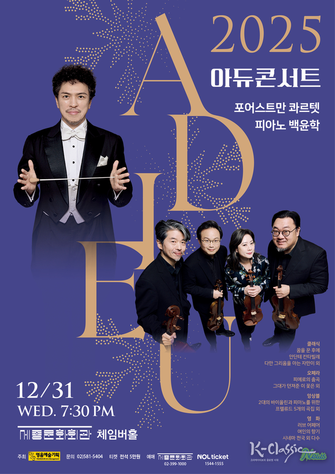 따뜻하고 아름다운 연말, 그리고 새로운 해의 시작을 앞둔 이 시점에서 2025년의 피날레이자 2026년의 프롤로그가 될 무대. 백윤학과 포어스트만 콰르텟이 함께하는 이번 공연은 한 해를 마무리하는 가장 품격 있는 선택이 될 것이다.