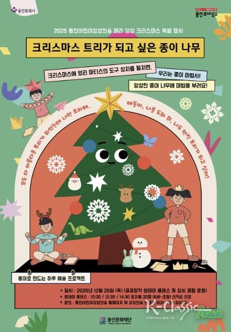K-Classic News 기자 | 용인문화재단은 오는 12월 25일에 크리스마스를 맞아 용인어린이상상의숲과 용인문화도시플랫폼 공생광장 일원에서 다양한 문화예술 프로그램을 즐길 수 있는 크리스마스 특별행사를 개최한다.