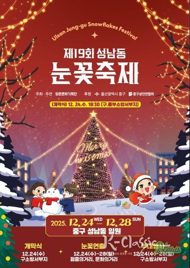 한편, 중구는 성남동 눈꽃축제와 연계해 옛 울산초등학교 앞~보세거리 입구 구간과 젊음의거리 등에 대형 성탄절 나무(크리스마스 트리), 종 모양 조형물, 2026 숫자 조형물 등을 설치해 운영하며 더욱 낭만적인 분위기를 연출할 계획이다.