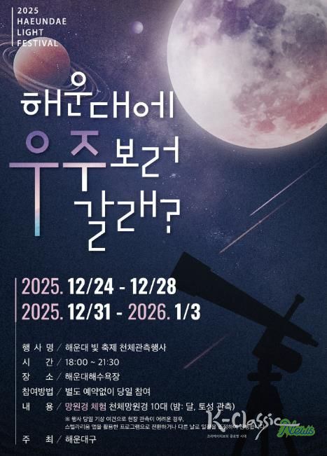 K-Classic News 기자 | 해운대구가 해운대빛축제 특별 이벤트 ‘우주 보러 갈래’를 12월 24~28일, 12월 31일~1월 3일에 운영한다.
