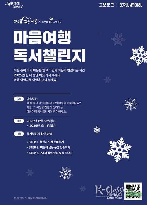 K-Classic News 기자 | 서울시가 ‘외로움 없는 서울’을 만들기 위한 노력의 일환으로 교보문고와 함께 여섯 번째 ‘마음여행 독서챌린지’를 진행한다. 이번 챌린지는 ‘마음결산’을 주제로, 올해 나의 마음을 움직인 책과 그 속에서 기억에 남는 문장을 선택해 ‘2025 마음결산 리포트’를 완성하며 한 해의 여정을 마무리한다.