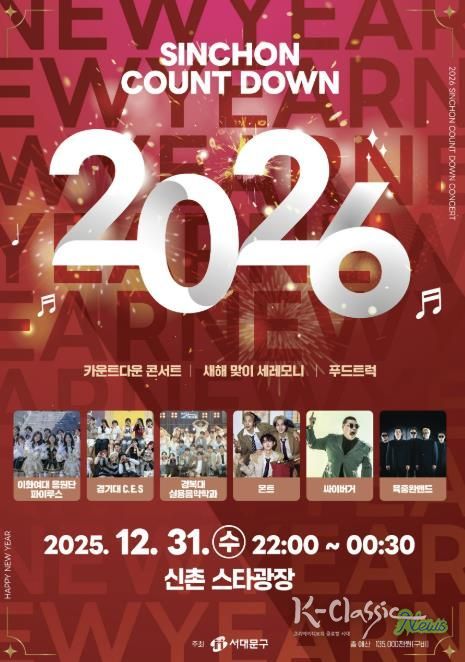 K-Classic News 기자 | 서대문구가 올해의 마지막 날인 이달 31일 밤 10시부터 새해 첫날인 1월 1일 0시 30분까지 신촌 연세로 스타광장에서 ‘2026 신촌 카운트다운 콘서트’를 개최한다.
