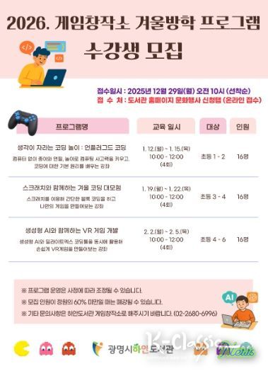 K-Classic News 기자 | 광명시 게임창작소는 오는 29일 오전 10시부터 겨울방학 프로그램 수강생을 모집한다.