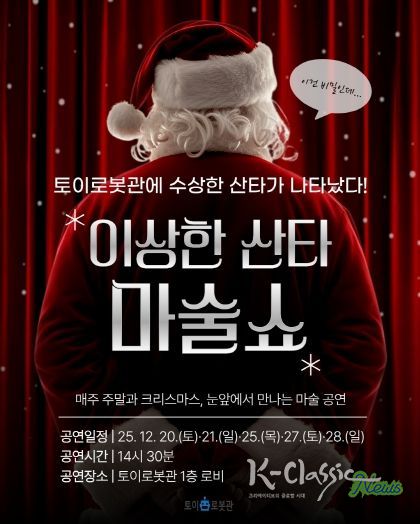 크리스마스 당일에는 ‘이상한 산타 마술쇼’가 펼쳐진다. 겨울 분위기에 어울리는 유쾌한 연출과 관객 참여형 구성으로 아이부터 어른까지 함께 즐길 수 있는 공연으로, 28일 주말까지 이어서 진행된다. 이와 함께 ▲산타와 함께 사진을 남길 수 있는 ‘이상한 산타와 한 컷’ ▲이상한 산타의 ‘선물 보따리’ 이벤트가 운영되며, 선물은 선착순 500명에게 제공되어 크리스마스 방문의 즐거움을 더할 예정이다.