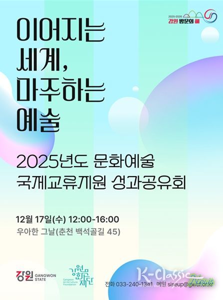 K-Classic News 기자 | 강원문화재단은 2025년도 문화예술 국제교류지원사업에 참여한 예술인들과 함께 12월 17일 춘천에서 성과공유회 '이어지는 세계, 마주하는 예술' 행사를 성황리에 마무리했다고 밝혔다.