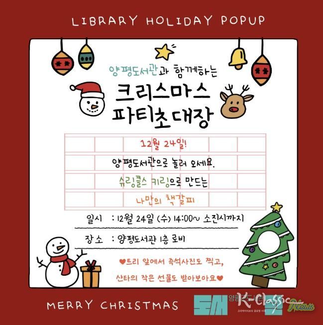 K-Classic News 기자 | 양평군은 지난 24일 양평도서관에서 진행된 ‘양평도서관 홀리데이 팝업! 슈링클스 책갈피·키링’ 체험행사가 성황리에 마무리됐다고 밝혔다.