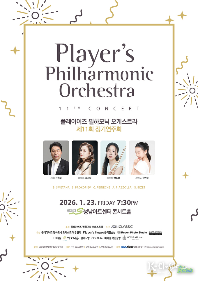 플레이어즈 필하모닉 오케스트라 제11회 정기연주회 성남아트센터서 개최, 단원이 중심이 되는 오케스트라가 선사하는 새해의 첫 울림 음악감독 및 상임지휘자 전형부가 이끄는 플레이어즈 필하모닉 오케스트라(Player’s Philharmonic Orchestra, )가 오는 1월 23일(금) 오후 7시 30분 성남아트센터 콘서트홀에서 제11회 정기연주회를 개최한다.