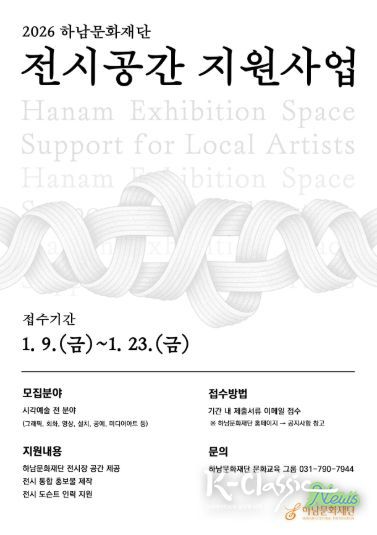 K-Classic News 기자 | (재)하남문화재단이 하남시를 기반으로 시각예술 분야에서 활동하는 지역 예술가를 지원하기 위해 '전시공간 지원사업' 참여 작가를 오는 23일까지 모집한다고 밝혔다.