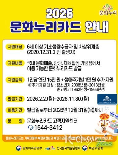 K-Classic News 기자 | 정부 정책에 따라 2026년부터 통합문화이용권(문화누리카드)과 청년문화예술패스 제도가 개편된다. 이에 따라 양주시는 개편 기준에 맞춰 지역대상자를 대상으로 해당 사업을 확대 시행한다고 밝혔다.
