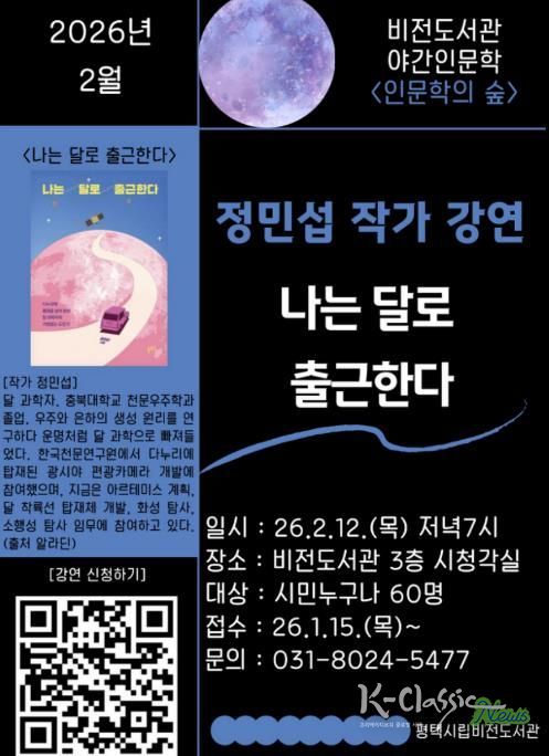 K-Classic News 기자 | 평택시 비전도서관은 오는 2월 12일 저녁 7시 달 과학자 정민섭 작가를 초청하여 ‘나는 달로 출근한다’를 주제로 야간 인문학 강연을 진행한다.