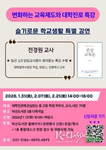 K-Classic News 기자 | 김포시 마산도서관이 1월 31일, 2월 7일, 2월 21일 2월 21일 3회에 걸쳐 오후 2시부터 4시까지 ‘변화하는 교육환경(슬기로운 학교생활)’에 관심이 있는 중고등학교 학부모, 교사, 학생 등 김포시민을 대상으로 특별강연을 운영한다.