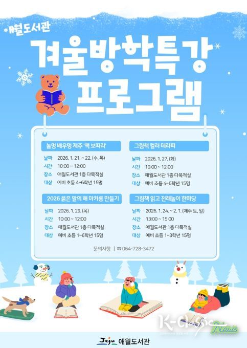K-Classic News 기자 | 제주시 애월도서관은 겨울방학을 맞아 어린이들이 책과 놀이, 체험 활동을 통해 즐겁게 배우고 독서에 대한 흥미와 창의력을 키울 수 있도록 ‘2026 애월도서관 겨울방학특강 프로그램’을 운영한다.
