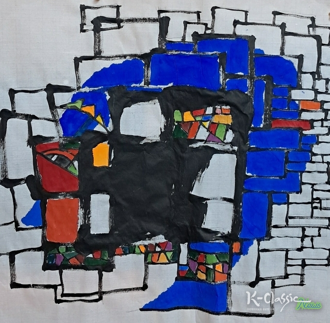오른쪽에 수직으로 배열된 다채로운 색면과 격자 구조 창문이자 또 다른 세계의 단면으로 읽힌다. 이는 질서화된 문명, 기억의 조각, 혹은 외부 세계의 신호처 화면 속 어둠을 가르며 존재한다. 반면 중앙의 작은 백색의 형상은 완전한 탈출도, 완전한 도달도 아닌 '가능성의 흔적'으로 남아, 관람자의 시선을 사유의 지점에 머물게 한다.