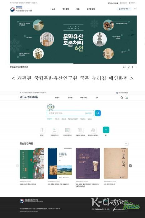 K-Classic News 기자 | 국가유산청 국립문화유산연구원은 연구원이 그간 축적해 온 국가유산 연구성과와 디지털 자료들을 누구나 더욱 편리하고 직관적으로 이용할 수 있도록 ‘국가유산 지식이음’ 누리집을 전면 개편했다.