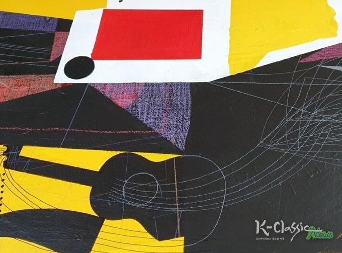 Against a dark ground, intense primary colors and restrained forms evoke tension and balance. The overlapping of circles, straight lines, and recurring curves suggests lingering vibrations-like a sound that continues to resonate after the music has stopped-implying that the ending point is not closure, but a momer erberation.