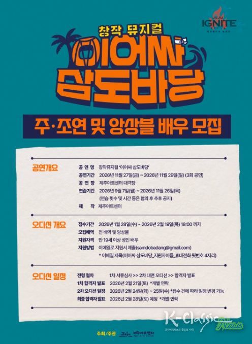 K-Classic News 기자 | 제주아트센터는 올해 11월 개최 예정인 창작뮤지컬 ‘이어싸 삼도바당’에 참여할 배우를 모집하고, 공연 오디션을 진행한다.