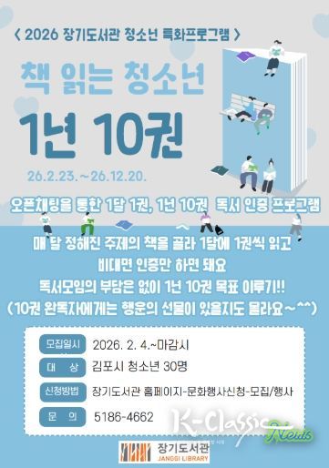 K-Classic News 기자 | 김포시 장기도서관은 청소년의 자발적인 독서 습관 형성을 위해 청소년 특화프로그램 ‘책 읽는 청소년 1년 10권’을 오는 2월 23일부터 연말까지 운영한다.