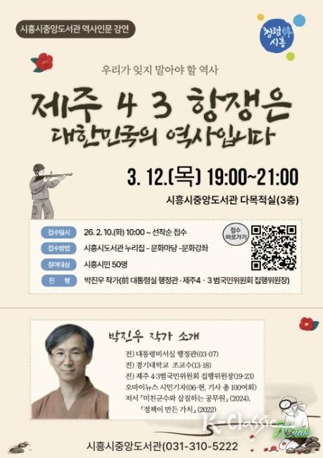 K-Classic News 기자 | 시흥시중앙도서관은 오는 3월 12일 오후 7시, 시민을 대상으로 역사 인문 강연 ‘제주 4ㆍ3항쟁은 대한민국의 역사입니다’를 운영한다.