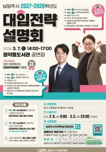 K-Classic News 기자 | 남양주시는 오는 3월 7일 정약용도서관 공연장에서 관내 고등학생과 학부모를 대상으로 ‘남양주시 2027~2028학년도 대입전략설명회’를 열고, 이에 앞서 2월 9일부터 참가 신청 접수를 진행한다.