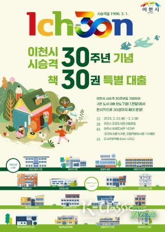K-Classic News 기자 | 이천시는 시 승격 30주년(시승격일 1996.3.1.)을 기념해 시민의 독서 참여를 확대하고 책 읽는 도시 이천의 정체성을 강화하고자, 오는 2월 23일부터 3월 2일까지 ‘책 30권 특별대출’ 서비스를 운영한다.