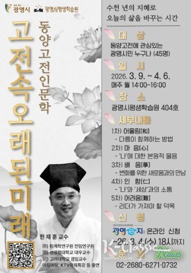 K-Classic News 기자 | 광명시 평생학습원은 오는 3월 9일부터 운영되는 광명지식상점 기획 강좌 ‘동양고전인문학: 인공지능(AI) 시대, 고전 속 오래된 미래’에 참여할 시민 40명을 모집한다.