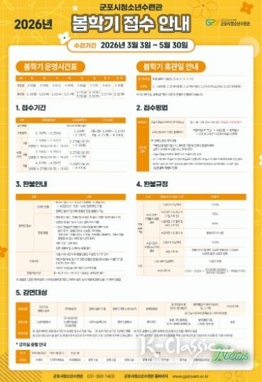 K-Classic News 기자 | (재)군포시청소년재단 군포시청소년수련관은 오는 2026년 3월 3일부터 5월 30일까지 ‘2026년 봄학기 문화체육 프로그램’을 운영하며, 2월 26일부터 신규 수강생 접수를 시작한다.