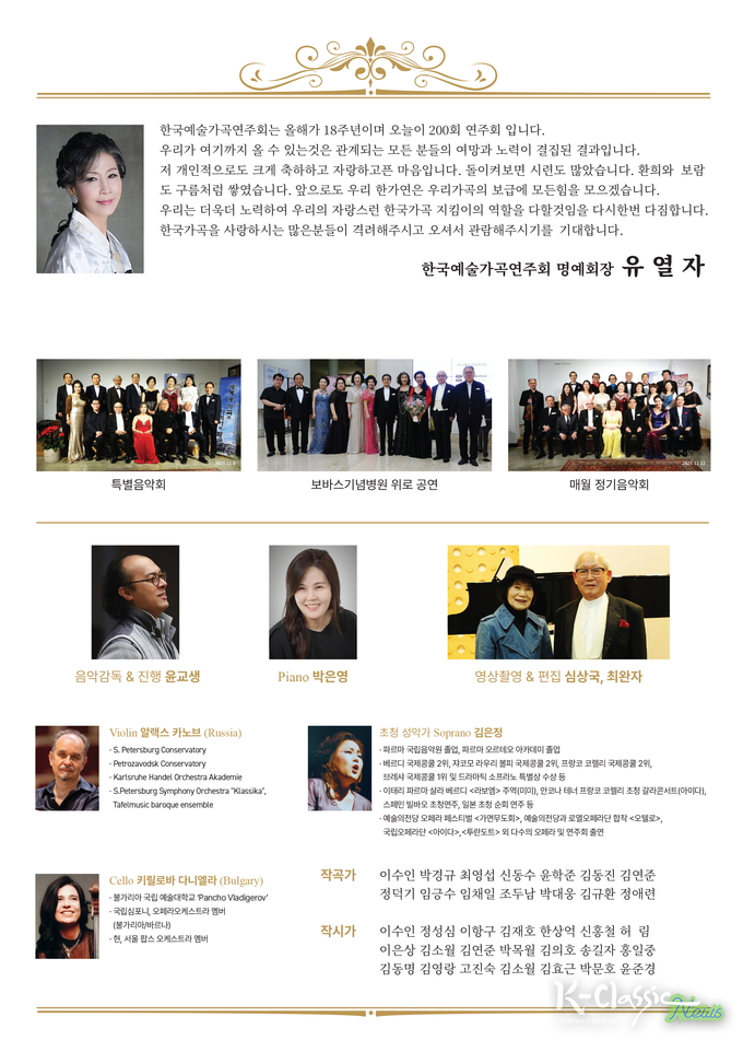 특히 음악감독 윤교생, 피아니스트 박은영을 비롯해 바이올린 알렉시 카노브, 첼리스트 키로바 다니엘라 등 협연진이 더해져 무대의 완성도를 높인다.