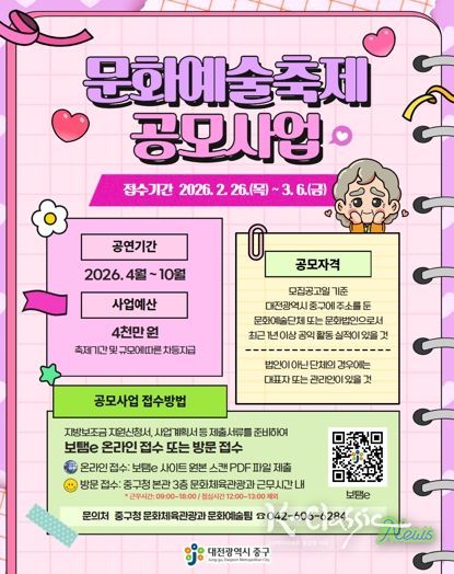 ‘문화예술축제’ 분야는 대전 중구에 주소를 둔 문화예술 단체 또는 문화예술 법인을 대상으로 한다. 축제 규모와 기간에 따라 단체당 500만 원 내외의 보조금을 지원하며, 접수 기간은 오는 26일부터 3월 6일까지다. 신청은 보탬e 누리집을 통한 온라인 접수 또는 중구청 문화체육관광과를 직접 방문해 할 수 있다.